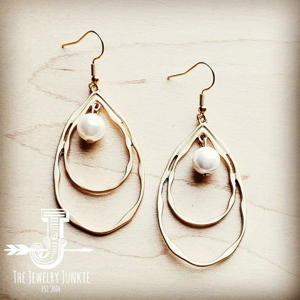 Add a touch of elegance and uniqueness to your look with our Matte Gold Double Hoop Earrings featuring a beautiful pearl dangle. Handmade with care, these earrings are sure to make a statement. Stand out from the crowd with this one-of-a-kind accessory! Matte Gold Hoop and Pearl Drop Dangle Earrings are the perfect complement to your boho style!